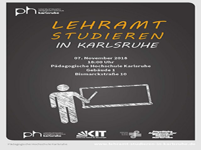 In einer gemeinsamen Abendveranstaltung informieren Pädagogische Hochschule Karlsruhe, Karlsruher Institut für Technologie (KIT), Hochschule für Musik Karlsruhe und Akademie für Bildende Künste Karlsruhe, welche Voraussetzungen für ein Lehramtsstudium gelten und wie die einzelnen Studiengänge aufgebaut sind. Beginn des Termins für Studieninteressierte und Eltern ist um 18 Uhr in der Pädagogischen Hochschule Karlsruhe, Bismarckstraße 10, Gebäude 1.