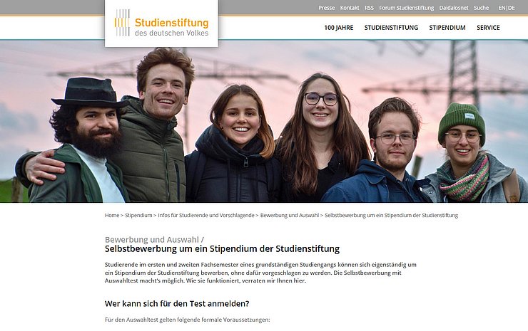 Das Selbstbewerbungsverfahren ist zweistufig: Die Schulnoten spielen bei der Selbstbewerbung keine Rolle. Vielmehr nehmen alle Kandidat:innen zunächst an einem kognitiven Fähigkeitstest teil. Die Anmeldung hierfür ist bis zum 12. Februar 2026 online möglich: https://www.studienstiftung.de/infos-fuer-studierende/bewerbung-und-auswahl/selbstbewerbung/